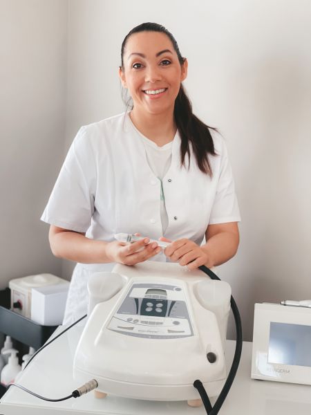 ‘De apparatuur die ik inzet, afhankelijk van de huidbehoefte, zijn onder andere de Skinpeeler Ultra (microdermabrasie en ultrasound), geschikt voor vrijwel elk huidtype en veel huidproblemen. Het geeft direct een prachtige glow en is inzetbaar als losse behandeling, maar ook ideaal als start van een kuur. De SkinNeedler is het meest effectief in kuurverband, waarbij je even de tijd moet nemen om resultaat op te bouwen. Daarna combineer ik deze graag met andere behandelingen voor onderhoud. De Vega RF geeft prachtige resultaten op het gebied van huidversteviging: contouren worden weer zichtbaar. Deze behandeling start ik altijd als kuur en pas wanneer de huid in goede conditie is. Deze ‘personal trainers’ zijn perfect om af te wisselen en in kuurvorm te combineren. Binnenkort breid ik mijn aanbod uit met de MesoJet – een veelzijdige en effectieve behandeling die vrijwel op ieder huidtype toegepast kan worden. Nu de dagen korter worden en de zonkracht afneemt, werk ik bovendien graag met Acid Peelings. Voor elke huid is er een zuurpeeling op maat, afgestemd op de specifieke behoefte.’