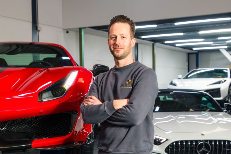 Wat SHIELD bijzonder maakt, begint al voordat de auto de werkplaats binnenrijdt. De wagen wordt namelijk veilig opgehaald bij de dealer of gewoon bij u thuis, vervoerd in een volledig gesloten trailer. Zo komt de auto zonder risico op steenslag of lichte beschadigingen aan – klaar voor de behandeling die hem jarenlang mooi houdt. BESCHERMLAAG Het paradepaardje van SHIELD is de hoogwaardige lakbescherming van XPEL. Deze zogenoemde Paint Protection Film is een vrijwel onzichtbare, transparante folie die zeer nauwkeurig over de lak wordt aangebracht. Het resultaat: een beschermlaag die de originele lak beschermt tegen steenslag, krassen en andere dagelijkse invloeden. Dankzij de ‘self-healing’ eigenschappen verdwijnen kleine krasjes als sneeuw voor de zon wanneer de folie wordt verwarmd met heet water of een föhn. Een groot voordeel is dat bij eventuele schade de auto niet opnieuw gespoten hoeft te worden. De folie kan simpelweg worden vervangen, zonder risico op kleurverschil. Het resultaat? Een auto die er weer uitziet alsof hij net de showroom heeft verlaten. originele lak veilig onder de folie behouden blijft.