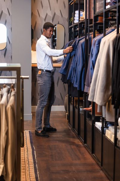 Ook de herencollectie ademt vernieuwing, vertelt Marco. ‘Het draait dit seizoen om luxe én gemak. Klassiek krijgt een ontspannen update: formele kleding wordt casual geïnterpreteerd. Comfortabele broeken zijn key: soepel katoen, stretch en een smalle rib. Ja, rib is terug – als losse broek en zelfs als pak voor een moderne, modieuze look. Alles voelt relaxed, zonder stijl te verliezen. De klassieke pakken zijn er nog steeds, maar casual krijgt de overhand. Denk aan merino shirts met zipper, overshirts en comfortabele jasjes met stretch.’