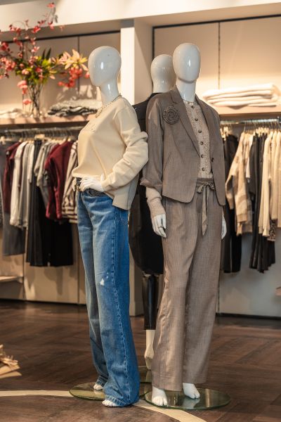 Zoals gezegd, mode is vernieuwend dit seizoen. Denk ook aan de sporty chic-invloeden: tennistruien, polo’s met een streep, alles met een elegante twist. Marieke vervolgt: ‘De ballonbroek is upcoming: wijd en comfortabel, gecombineerd met een royale top. Daarnaast zien we veel hoge broeken met korte tops. En dan is er nog een opvallende comeback: schoudervullingen. Niet zoals vroeger, maar kleiner en ronder, elegant en vrouwelijk.’ Inspiratie komt deels uit de jaren ’70 met een boho touch, maar ook de retro revival doet zijn intrede.