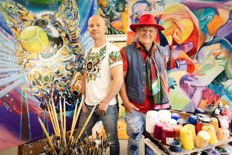 De samenwerking met zijn vader en de optimistische sfeer in de kunstwereld inspireerden Mitja om zelf ook weer vaker het penseel op te pakken. ‘Schilderen deed ik altijd al’, zegt hij. ‘Maar ik zag mezelf nooit als kunstenaar. Een paar jaar geleden liet ik toch eens wat werk aan galeries en kunstenaars zien. De reacties waren veelbelovend. Inmiddels heb ik een eigen stijl ontwikkeld en mijn plek in de kunstwereld veroverd. In de basis zijn mijn schilderijen klassiek opgezet, net als bij mijn vader. Vervolgens ‘gooi’ ik er een illustratieve saus overheen; een abstracte cartooneske afbeelding. Mijn werk is kleurrijk en sluit goed aan bij dat van mijn vader.’