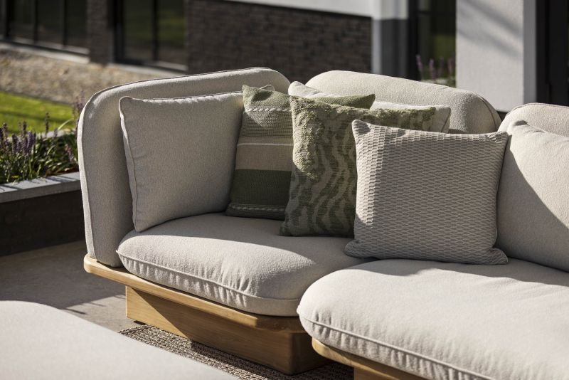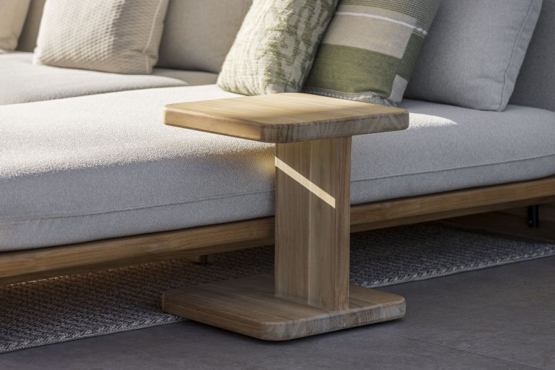 De basis van de collectie is uitgevoerd in massief teak. De solide belijning geeft het ontwerp een krachtige aanwezigheid, terwijl het natuurlijke materiaal warmte en gelaagdheid toevoegt. De zandkleurige stoffering versterkt het ingetogen karakter en zorgt voor een rustige, harmonieuze uitstraling die moeiteloos aansluit bij zowel moderne architectuur als meer natuurlijke tuinen.